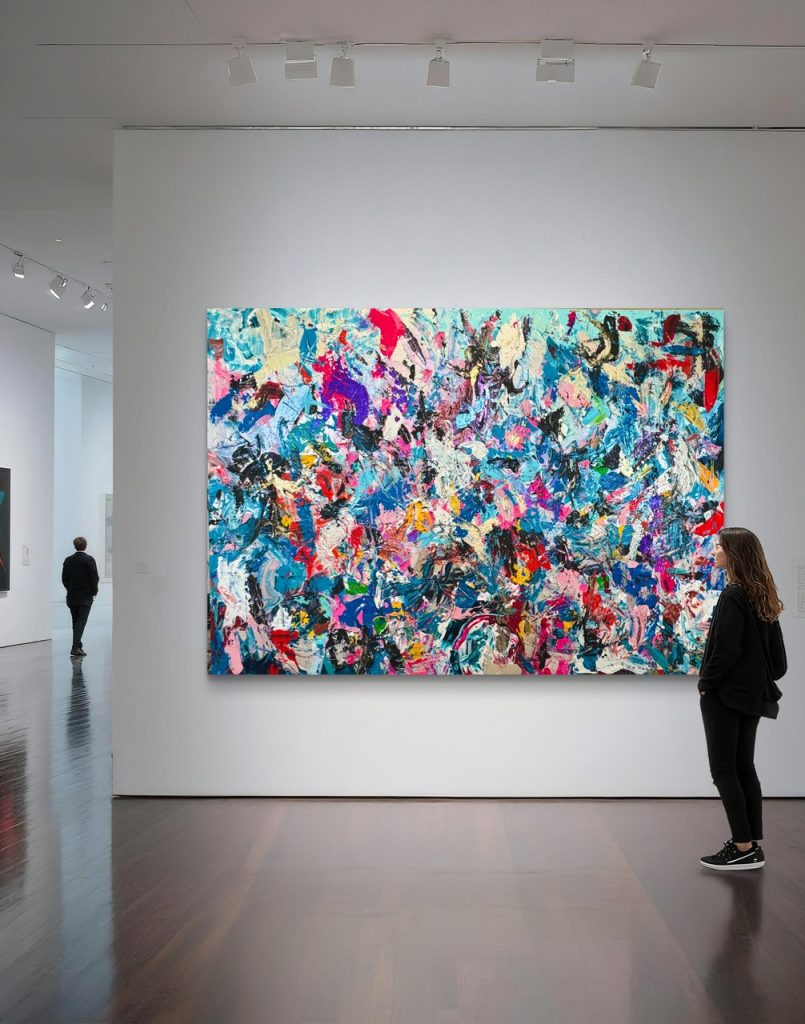 Influencé dès l’enfance par Riopelle, Pollock et Borduas, Fortin prolonge aujourd’hui leur élan de liberté à travers un travail profondément incarné. Dans ses nouvelles œuvres, il explore la transmission, la trace et la mémoire vivante. Ses toiles, denses et lumineuses, mêlent charbon, empâtements et couches de matière. Les couleurs éclatent, se confrontent, se superposent, créant des univers immersifs où l’œil entre littéralement dans la toile. Chaque œuvre devient un territoire à habiter, une expérience physique et émotionnelle.