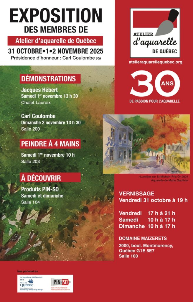 Le Domaine de Maizerets accueillera l’exposition annuelle de l’Atelier d’aquarelle de Québec (AAQ), qui célèbre sa trentième année d’existence. Les 31 octobre, 1er et 2 novembre 2025, l’exposition offrira aux visiteurs l’occasion de vivre une expérience artistique inoubliable. Ils pourront rencontrer les aquarellistes membres de l’AAQ et admirer leurs œuvres exceptionnelles. Le vernissage et la remise des prix Olivier-Toupin auront lieu le vendredi soir à partir de 19 h sous la présidence d’honneur de Carl Coulombe, aquarelliste.